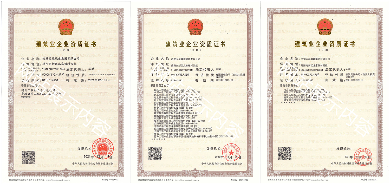 浩龍?zhí)煨浅墙瘓F(tuán)有限公司,2007年成立于“李白故鄉(xiāng)、中國科技城”—四川省綿陽市,企業(yè)注冊(cè)資本金5.0008億元。公司共有27項(xiàng)建筑業(yè)企業(yè)資質(zhì),其中國家一級(jí)資質(zhì)11項(xiàng),二級(jí)資質(zhì)10項(xiàng),三級(jí)資質(zhì)5項(xiàng),特種資質(zhì)不分等級(jí)1項(xiàng),類別涵蓋建筑、市政、水利、機(jī)電、隧道、起重設(shè)備安裝等基礎(chǔ)及未來發(fā)展重點(diǎn)專業(yè)。公司...